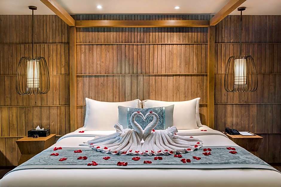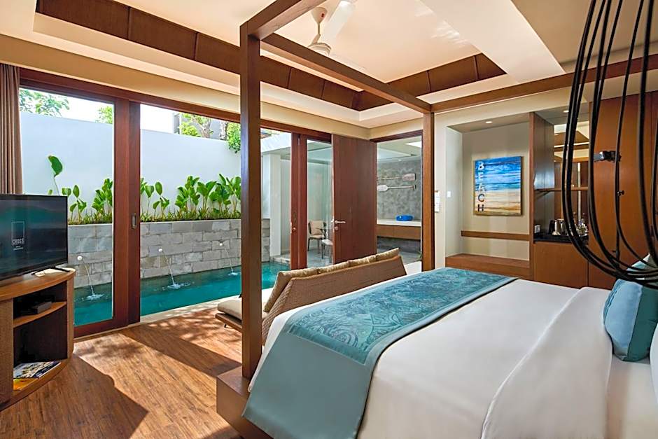 Cross Bali Breakers is a five-star retreat in Jimbaran, where two outdoor infinity pools invite sun-soaked moments with an adults-only vibe. Some villas feature private pools, adding a personal splash of luxury to the stay. A water park (extra charges), spa/wellness packages, and the on-site Point Break restaurant—serving Chinese, Indonesian, Italian, seafood, local, and international flavors in a modern, romantic setting—round out the experience.
